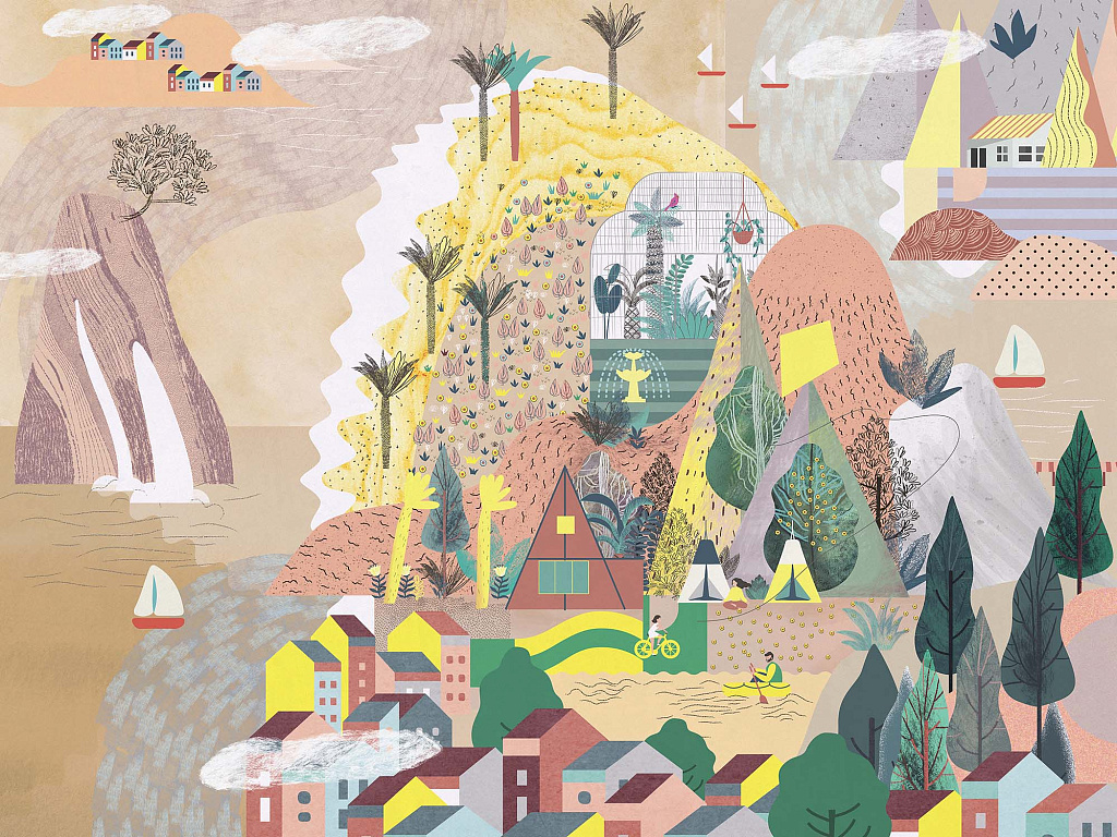 - Рисунок: Живопись, Горы, Люди, Деревья, Река